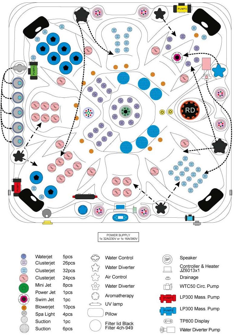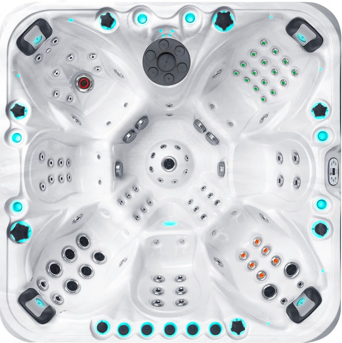 Jacuzzi z hydromasażem Passion Spas Excite Mighty Wave to nowoczesne SPA z głębokimi fotelami kubełkowymi, dyszami masującymi i 7 miejscami. Wykonane jest z winylu i poliestru w technologii Aristech® Acrylic, posiada trójwarstwową izolację, powłokę ochronną Everlast™ i system oczyszczania wody. Technologia Hybrid Heating™ zwiększa ciepło i zmniejsza zużycie energii. Posiada programowalne włączanie i wyłączanie. Wymiary: 224х224х91 cm Pojemność: 1450 litrów Liczba dysz masujących: 104 (92 wodnych, 12 powietrznych) System audio ze stacją dokującą do iPoda, 2 zintegrowane głośniki